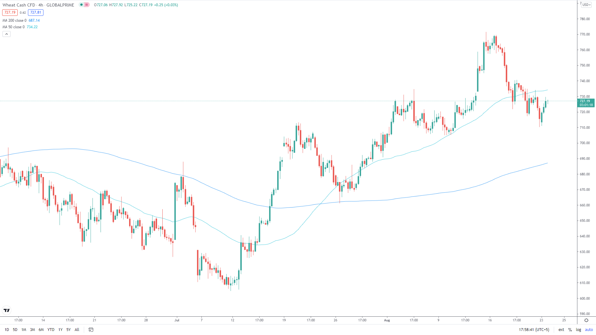 Image 1. The 50 and 200-period moving averages are plotted on the 4-hour chart at the commodity Wheat. Notice how the lines act as possible support and resistance.