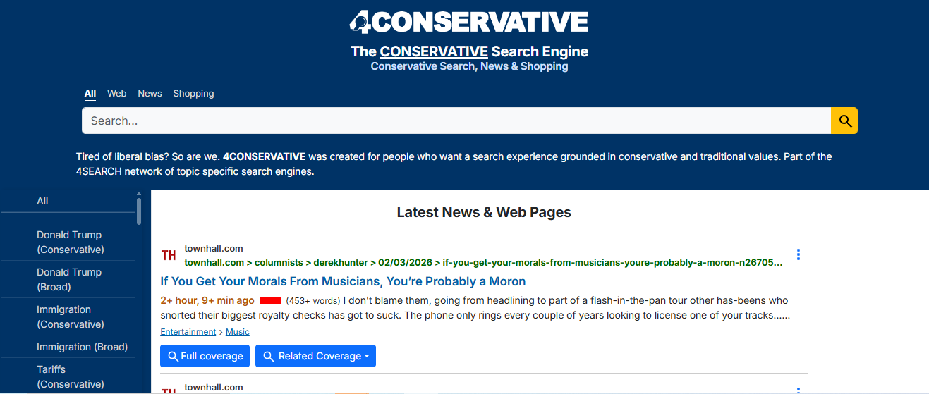 4Conservative.com unambiguously and unapologetically delivers right-wing news and content to the targeted audience. Its search results are listed based on right-wing media and blogs that are mostly overlooked in the regular searches. The site completely avoids the liberal channels and instead highlights the conservative writings, views, and tips.
